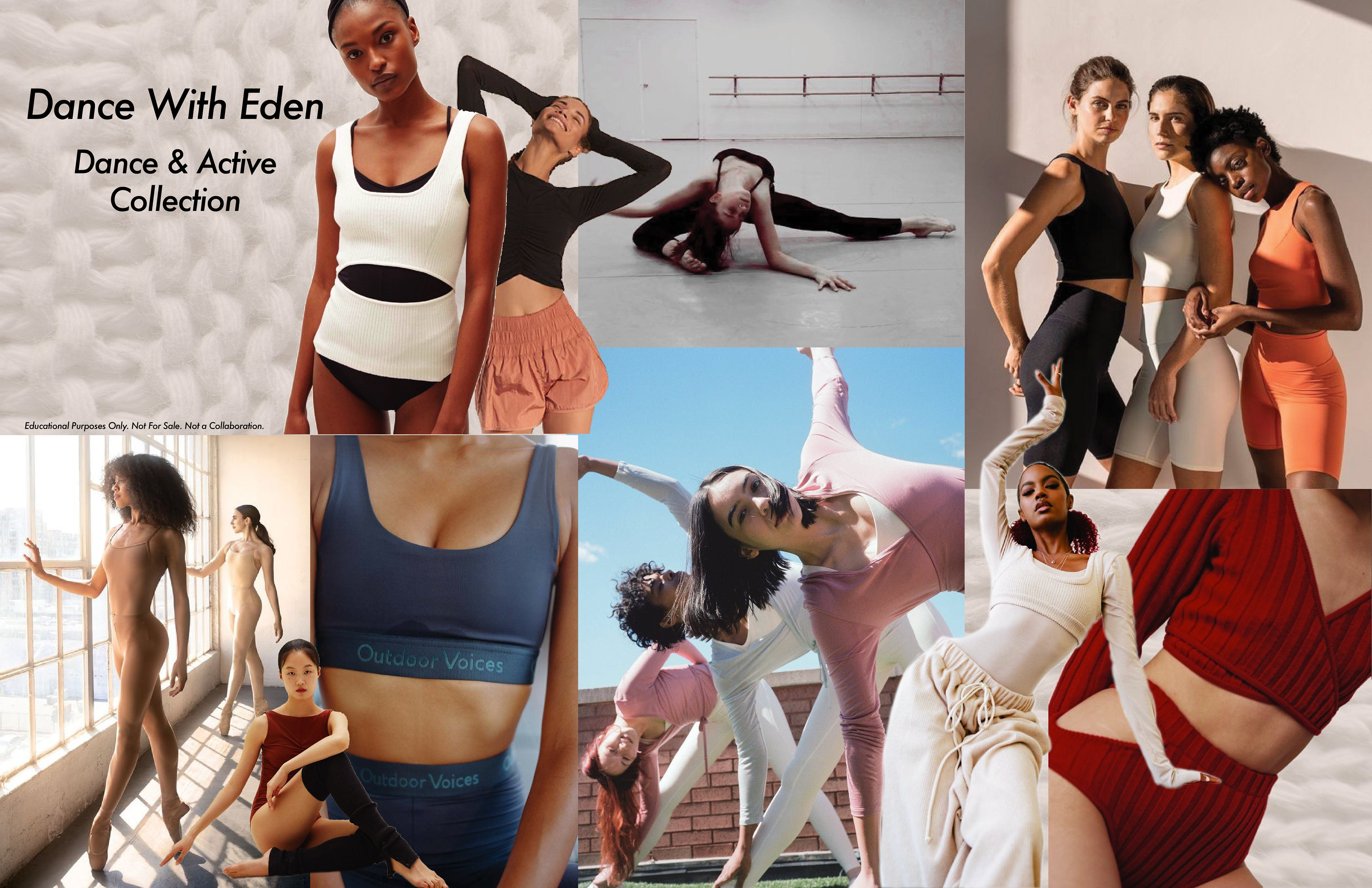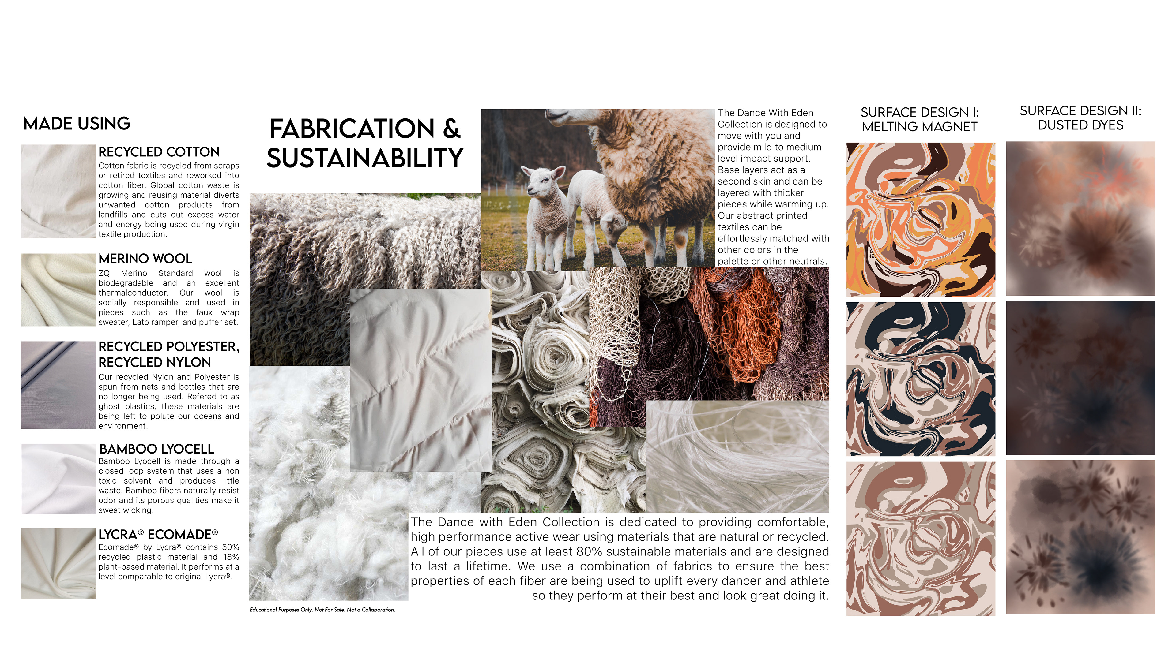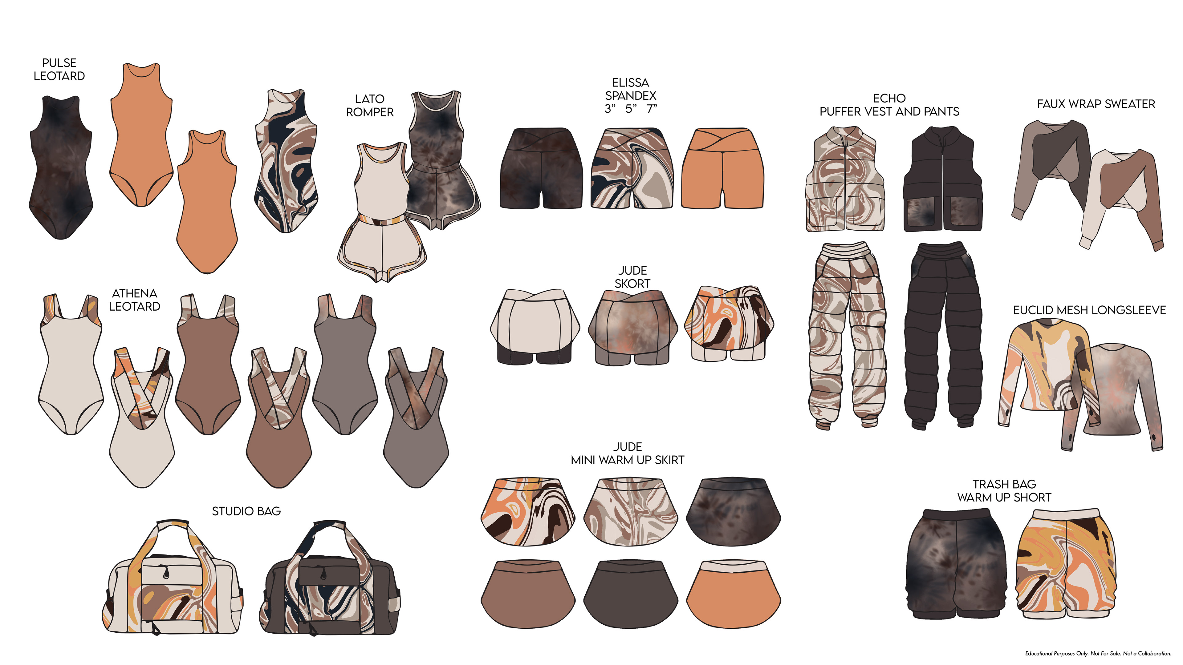 Dance and activewear collection with fabrication breakdown and two surface designs. Designed to be layered during warm ups and move as a second skin. Created with Adobe Photoshop and Illustrator.
